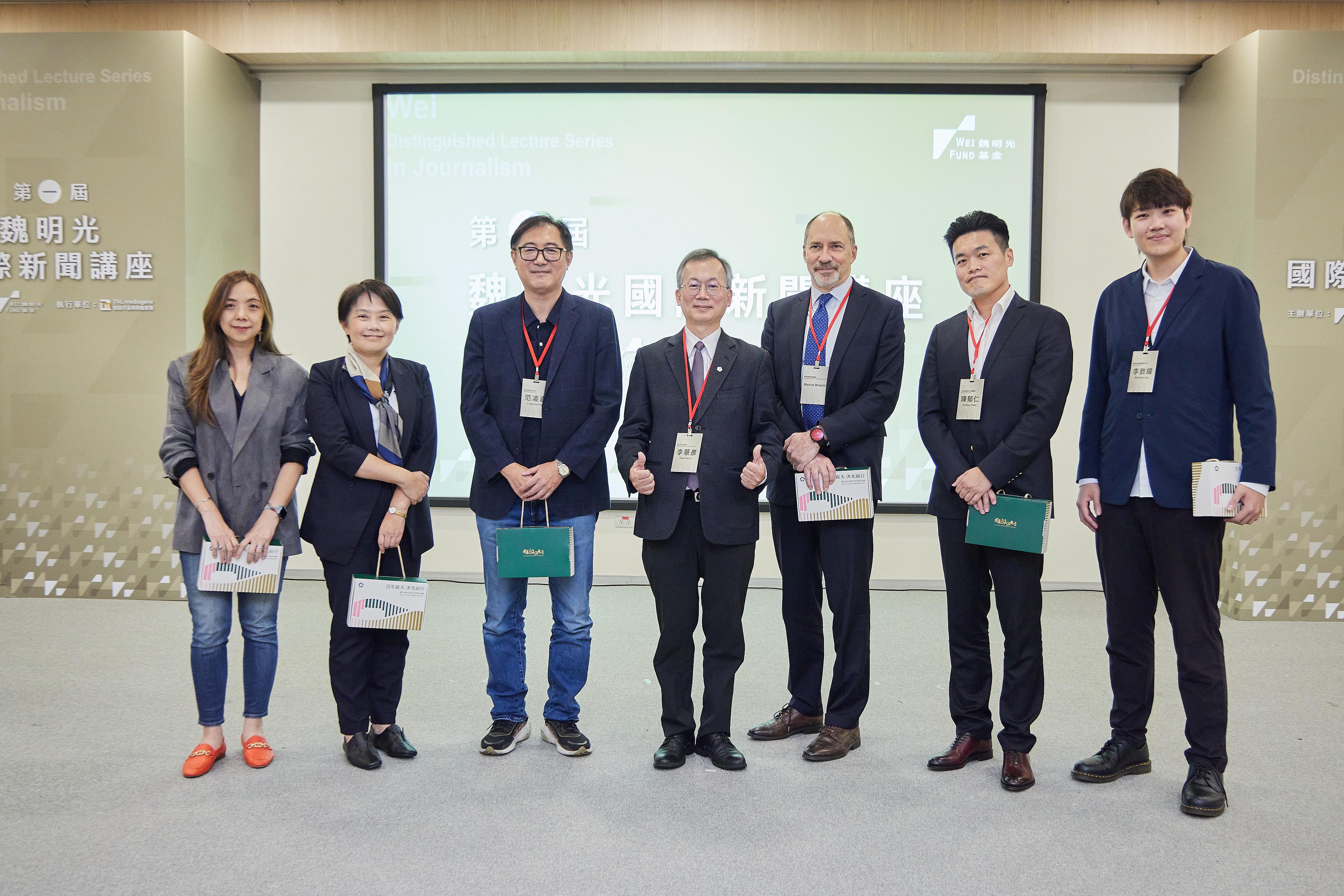 在活動尾聲,政大校長 李蔡彥 代表學校與基金會致詞,感謝與會嘉賓的精闢見解。他指出,「魏明光國際新聞講座」的設立,承載著推動新聞專業與公共服務的使命,希望透過國內外媒體人的對話與交流,重申查證、求真與社會責任的重要價值。他呼籲「魏明光新聞獎」現正徵件中,截止日期至12月15日,期望持續鼓勵新聞工作者以專業與創新為社會帶來更多啟發。基金會期望透過獎項,向在浪潮中仍堅守真相的媒體人致敬,也鼓勵更多年輕記者投入公共議題,成為推動社會進步的力量。