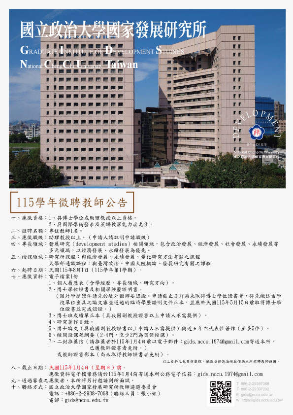國立政治大學國家發展研究所115學年徵聘教師公告
