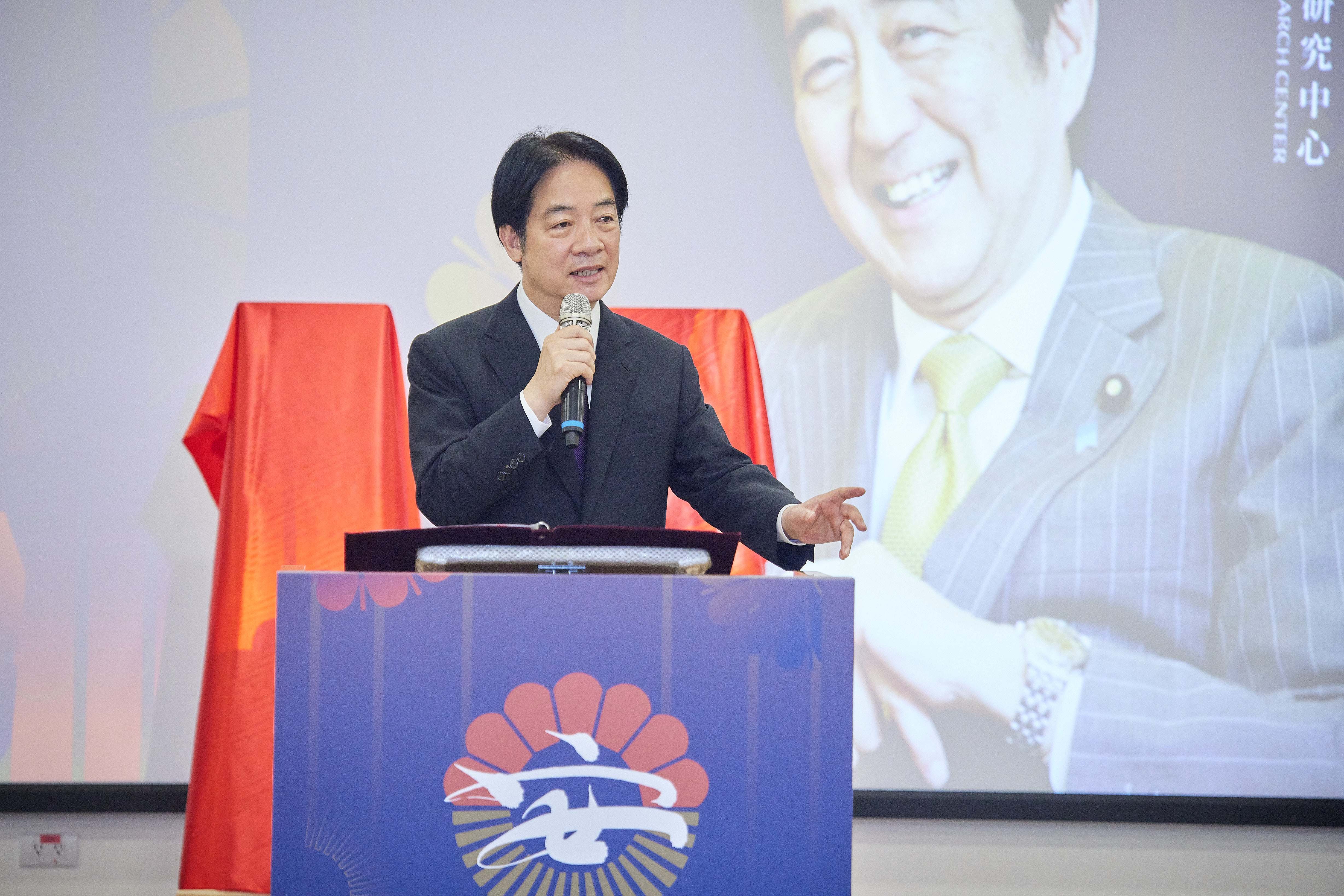 賴清德總統親臨會場致詞,他首先向來自日本與臺灣的政界與學界代表致意,並感謝政治大學籌劃這座研究中心。他指出,安倍晉三的離世不僅是日本的損失,也是臺灣與全世界的損失,期許這個中心能成為「安倍政經塾」,不僅研究安倍的思想與政策,也要培育人才,推動臺日合作。他要求教育部全力支持政治大學,讓研究成果能夠造福兩國甚至全世界。