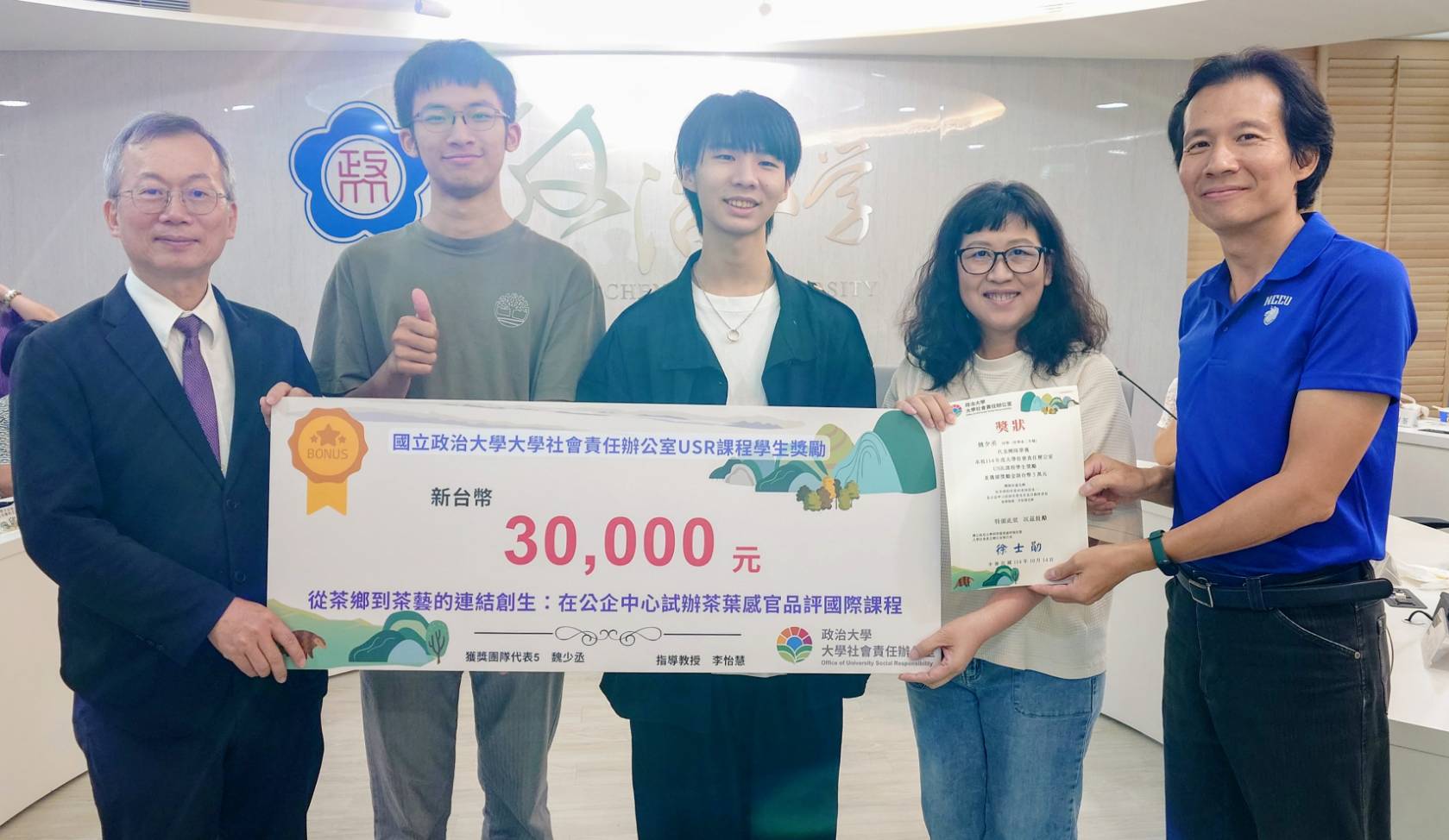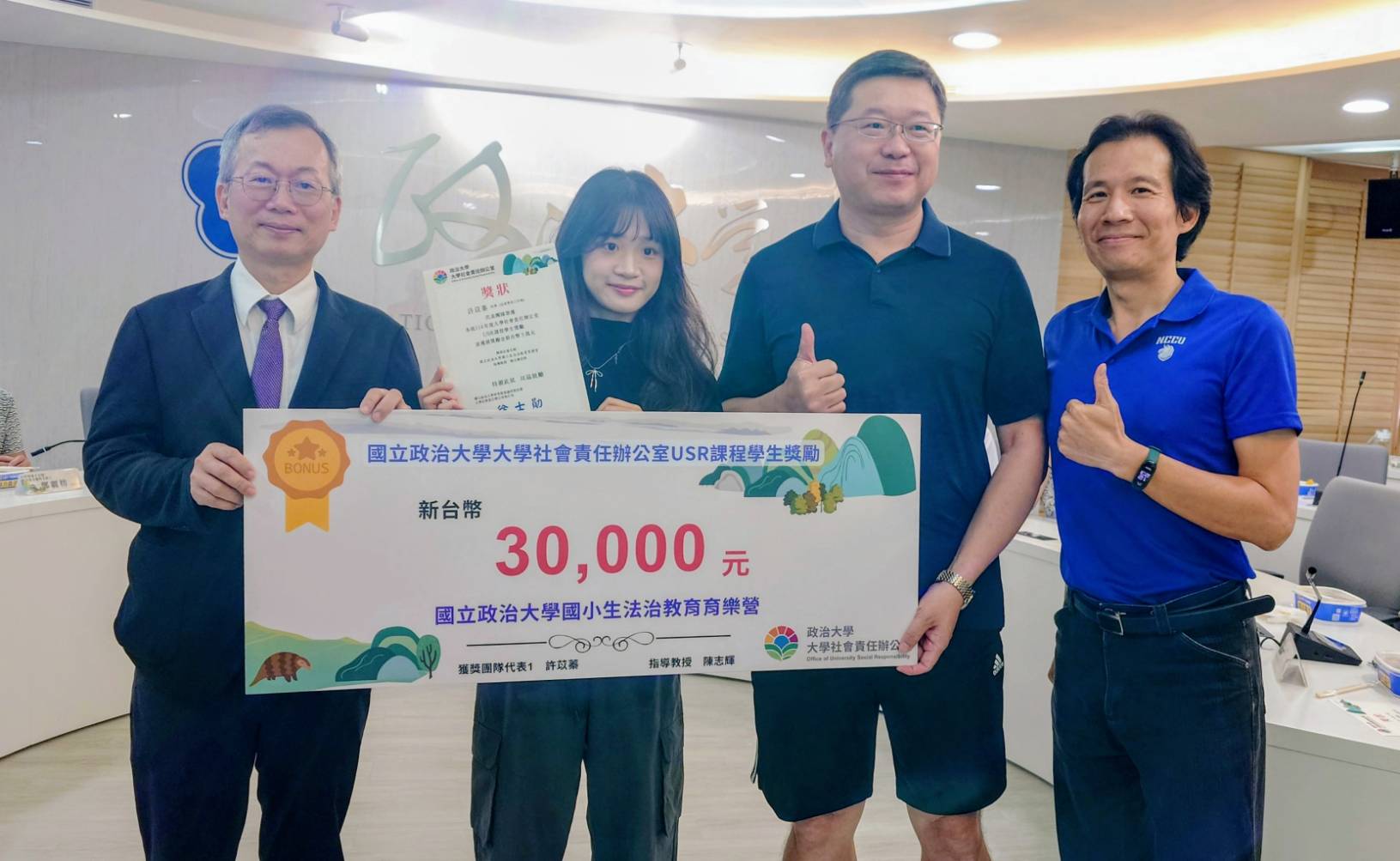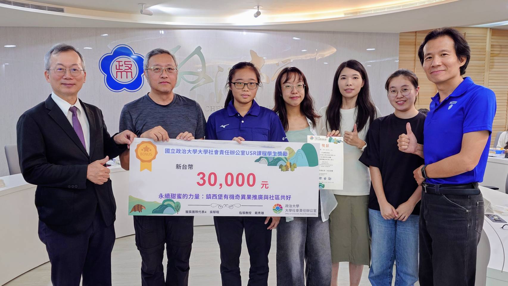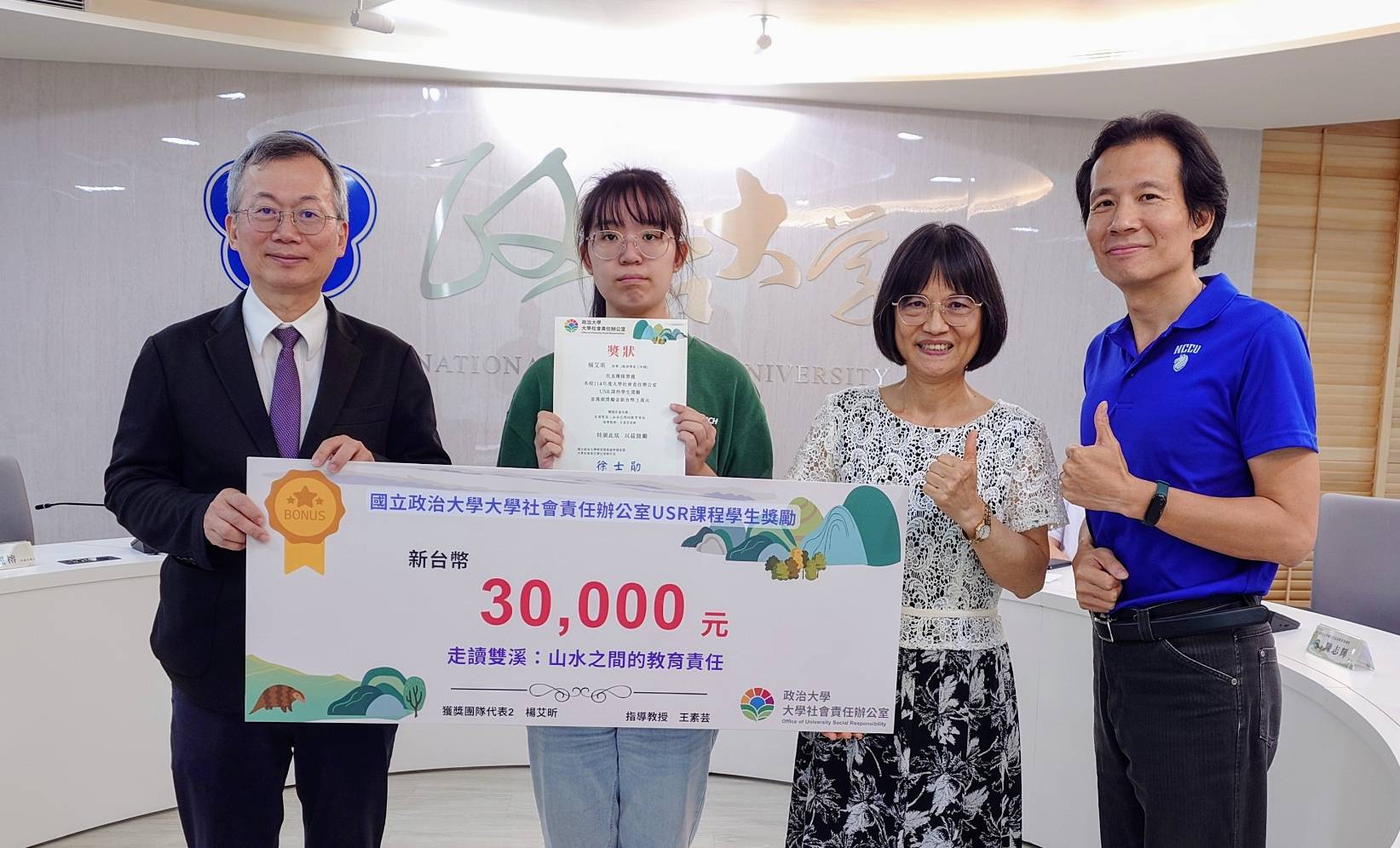 為鼓勵學生積極參與大學社會責任(USR)計畫,實踐學以致用的精神,本校大學社會責任辦公室(簡稱「社責辦」)於10月14日(二)假行政大樓6樓簡報室舉行「政大USR計畫第七次交流會議暨USR課程學生獎勵頒獎典禮」。李蔡彥校長、社責辦執行長徐士勛研發長、副執行長王雅萍老師、與校內各USR計畫主持人及助理皆親臨參與,並由校長、研發長頒獎給獲獎學生。
