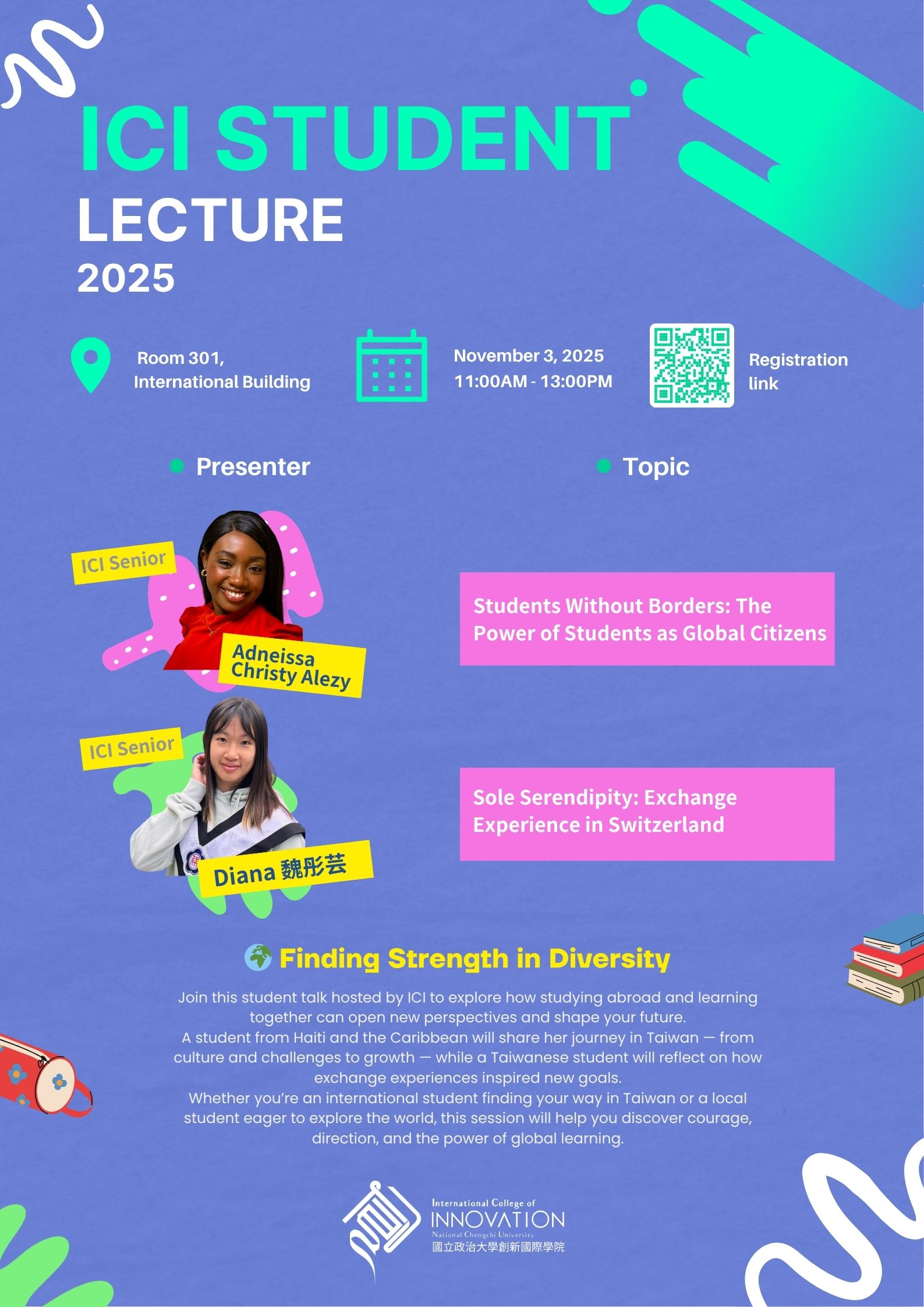 誠摯邀請您參加兩位 ICI 學生帶來的精彩分享——她們將以真實經驗,展現如何把挑戰化為行動,創造在地與全球的影響力。 🌍✨