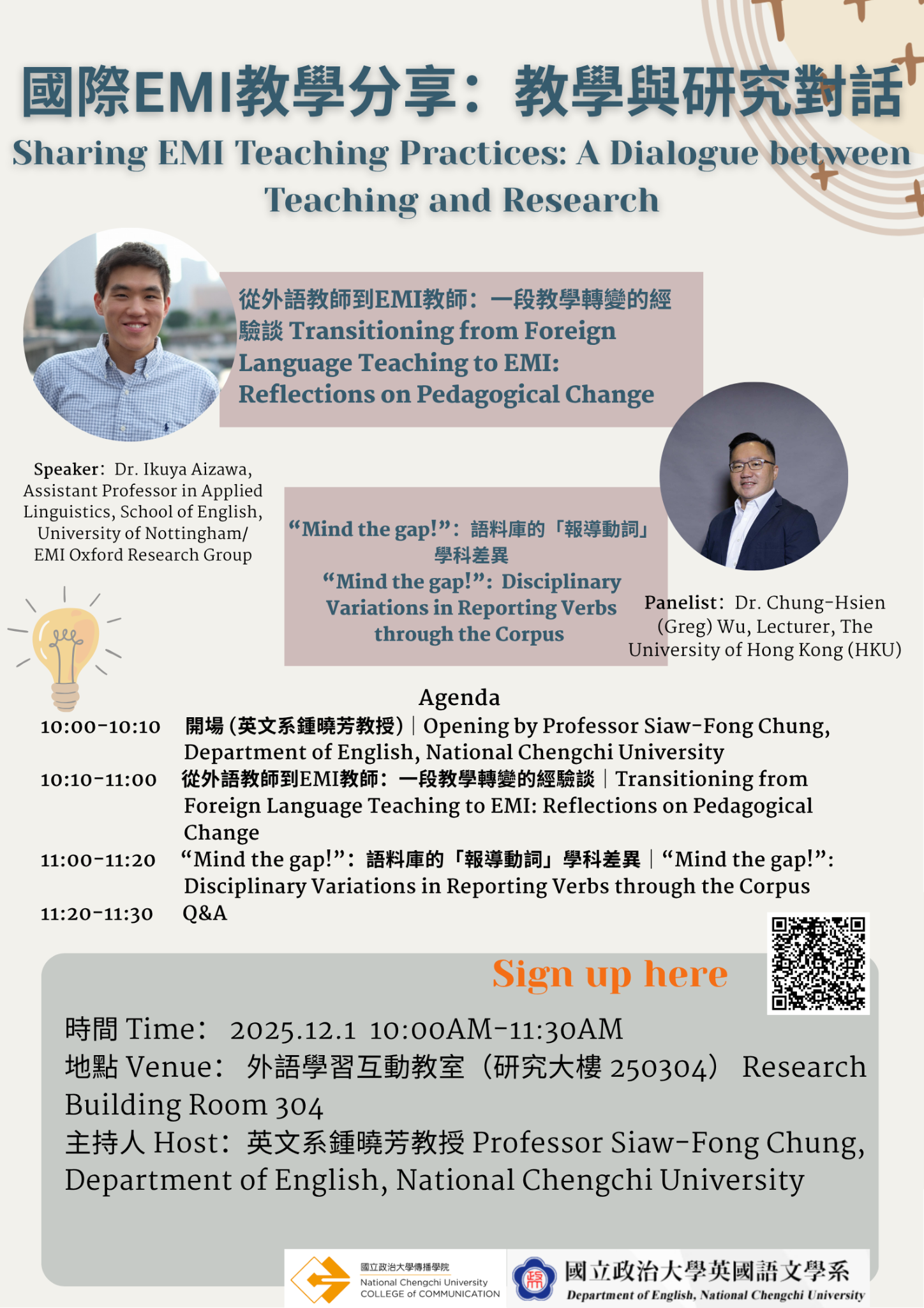 誠摯邀請您參加由國立政治大學傳播學院與英國語文學系共同主辦的學術講座。 本場講座由英國語文學系鍾曉芳教授主持( 特邀英國諾丁漢大學應用語言學系,同時也是EMI Oxford Research Group成員的助理教授 Ikuya Aizawa 博士主講。Ikuya Aizawa 博士將以「外語教師的轉型與 EMI 教學」為題,分享其豐富的實務經驗與深刻的教學反思。 此外,我們亦邀請香港大學吳忠憲博士擔任與談人,帶來學科差異的精彩交流——「Mind the Gap!:語料庫中的『報導動詞』學科差異」。吳博士將深入探討英語報導動詞在不同學科語篇中的使用差異,啟發對語言與學術寫作的全新思考。 誠摯期待您的蒞臨,共同參與這場跨領域、兼具理論與實務的知識盛宴。