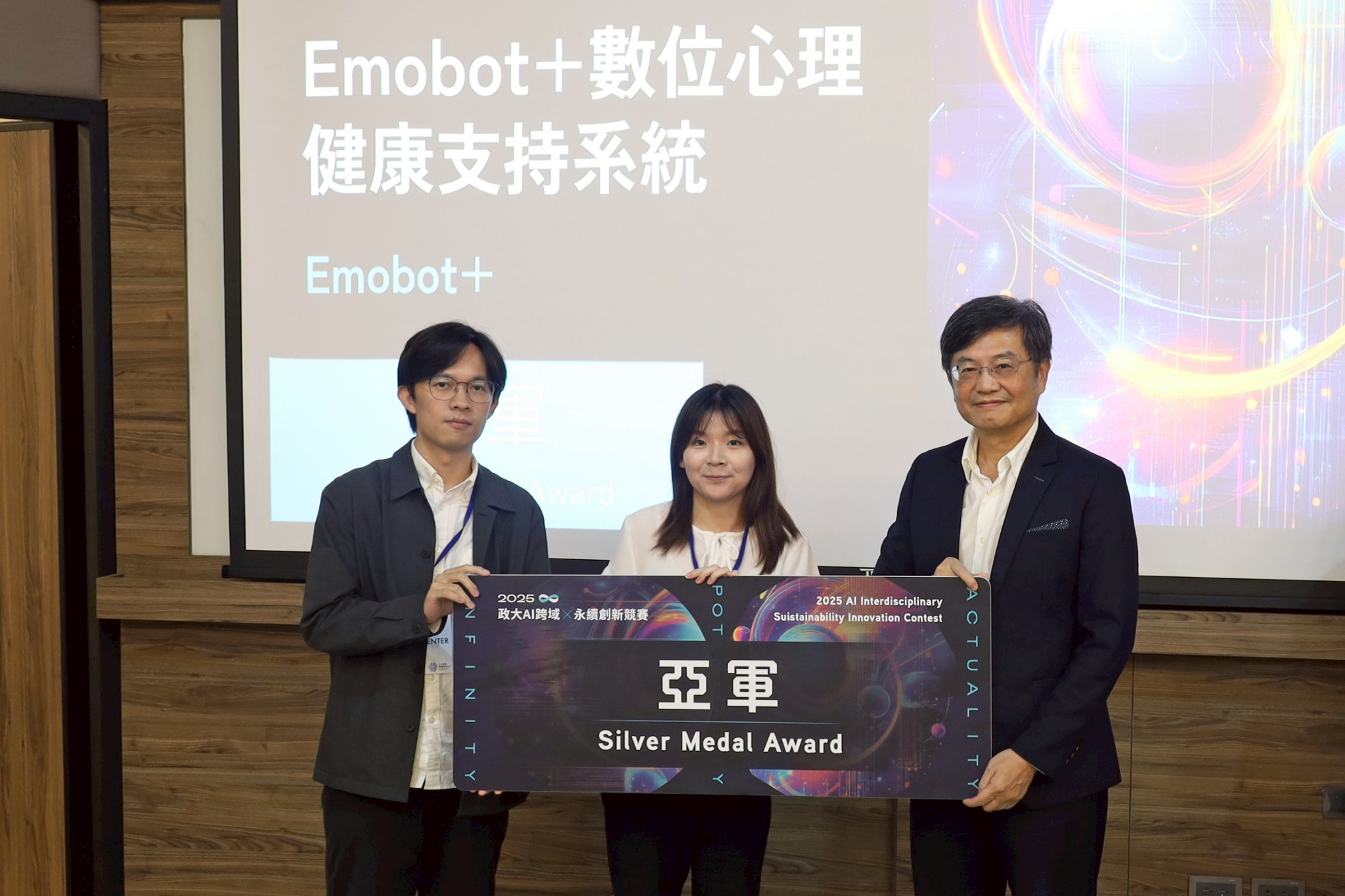 而亞軍「Emobot+」團隊提出數位心理健康支持系統,以情感聊天機器人為核心,透過演算法媒合不同機器人角色,提供個人化情緒陪伴與風險偵測,並在使用者同意下串接校方輔導資源,打造永續心理健康支持網絡。季軍「政大通 NCCU Pass」則運用 Vision Transformer 與大型語言模型開發智慧尋物平臺,自動比對拾獲物品影像與描述,通知失主找回遺失物,改善校園尋物流程。