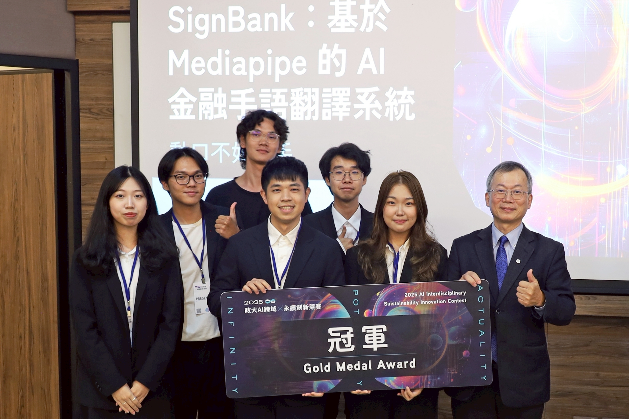 「動口不如動手」團隊自 13 組隊伍中脫穎而出,奪下本屆競賽冠軍。其開發的「SignBank:基於 Mediapipe 的 AI 金融手語翻譯系統」致力於提升聽障者在金融服務中的溝通便利性。系統以 MediaPipe 為核心技術,提供雙向即時翻譯,能將聽障者的手語精準轉換為中文文字,也能將一般使用者的語音轉文字後,由螢幕中的虛擬手語角色即時呈現手語動畫,實現雙向無障礙互動。為補足手語訓練資料不足的挑戰,團隊運用 DeepMotion 進行動作捕捉,並將 3D 動畫匯入 Blender 以程式自動生成多角度手勢影像,大幅提升模型準確度與可擴充性。本系統聚焦金融情境,針對高頻詞彙進行優化,展現 AI 技術在無障礙與共融服務上的創新應用。