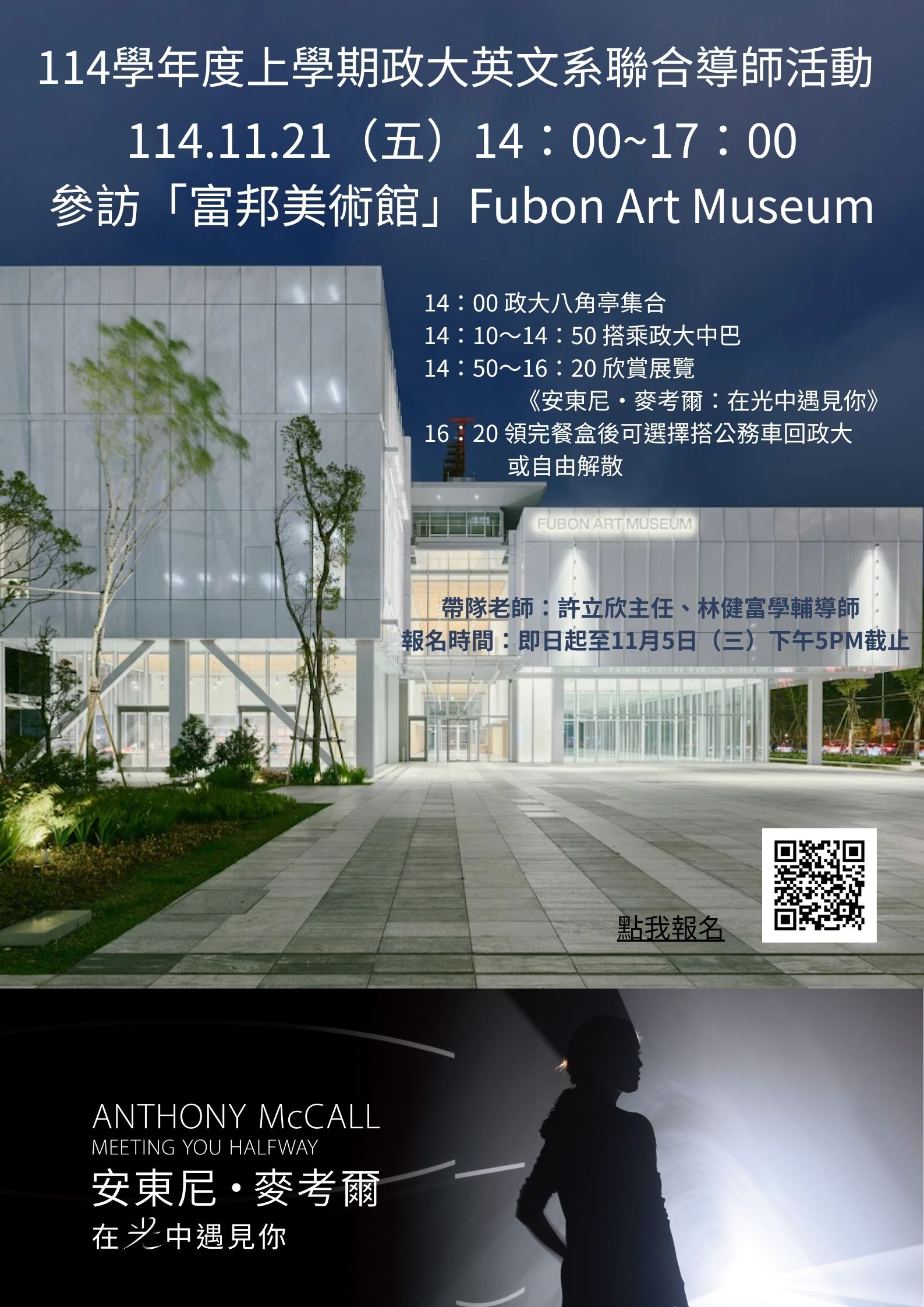 In the crisp atmosphere of this November, faculty and students from the NCCU Department of English visited the Fubon Art Museum to view Meeting You Halfway, a special exhibition by British artist Anthony McCall. This off-campus visit not only allowed students to extend their aesthetic experience from literary texts to real-life artistic spaces, but also strengthened communication and interaction between teachers and students through the shared activity of viewing art.