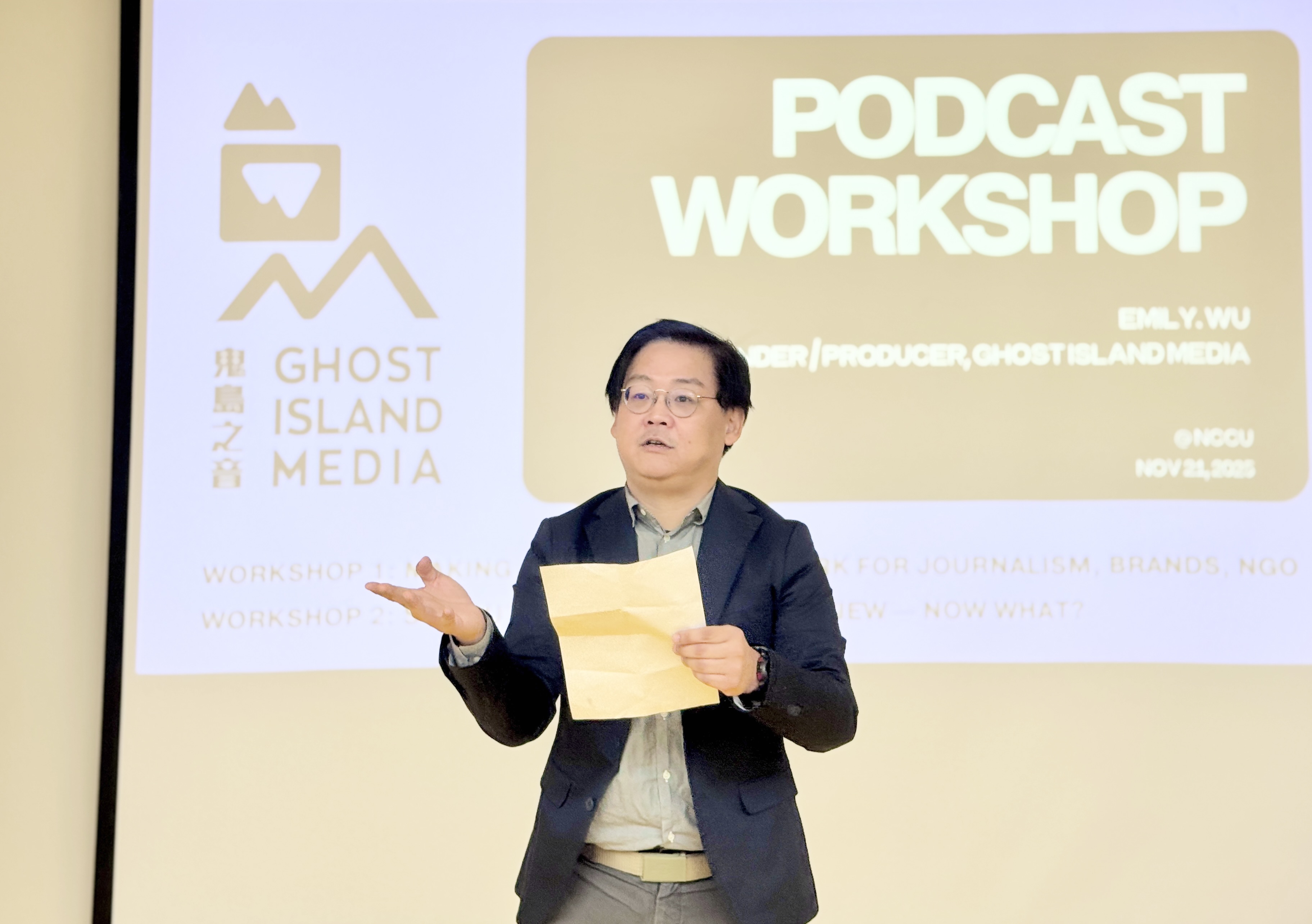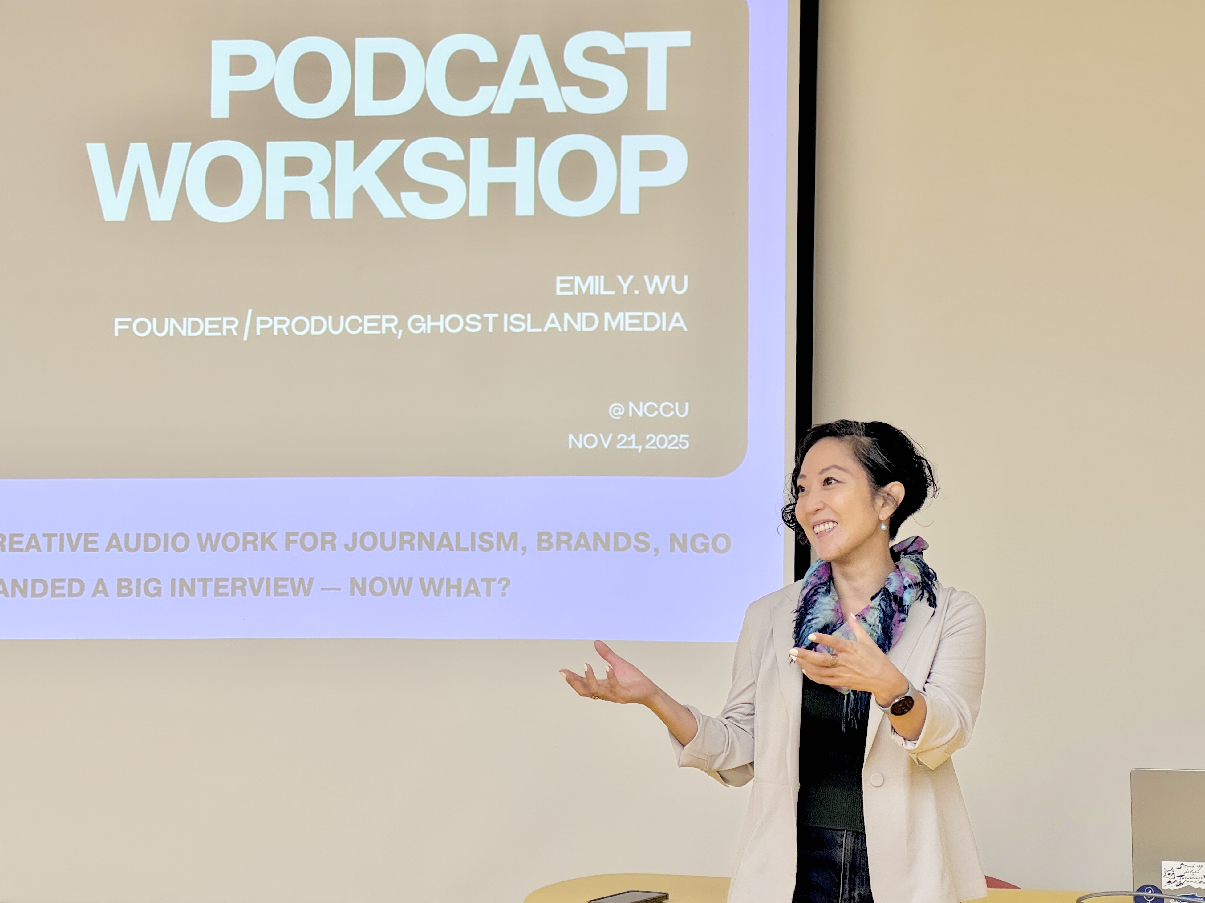 On Nov. 21, 2025, Voice of NCCU, in collaboration with IMICS, hosted a podcast workshop featuring Ghost Island Media founder Emily Wu (吳怡慈), who shared expert tips on creating successful audio stories.