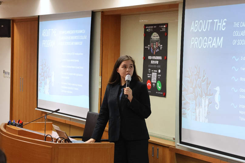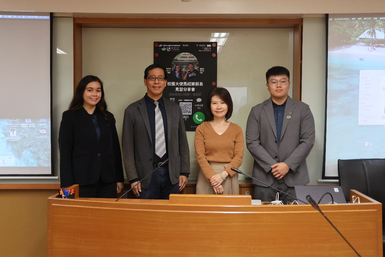 政大社科院與財團法人國際合作發展基金會(TaiwanICDF,簡稱國合會)合作推動校園大使海外見習計畫,今年邁入第二屆,由亞太碩(IMAS)泰秀立(Catherine Tadlock)同學與國發所劉又名同學擔任校園大使,遠赴友邦馬紹爾群島參與國合會技術團之援外見習。社科院於 11 月19 日舉行分享會,邀請今年度兩位校園大使分享海外見習的經驗與成果。活動由社科院劉曉鵬副院長主持,國合會公共關係室吳台生主任親自出席,吸引多位同學到場聆聽與提問。