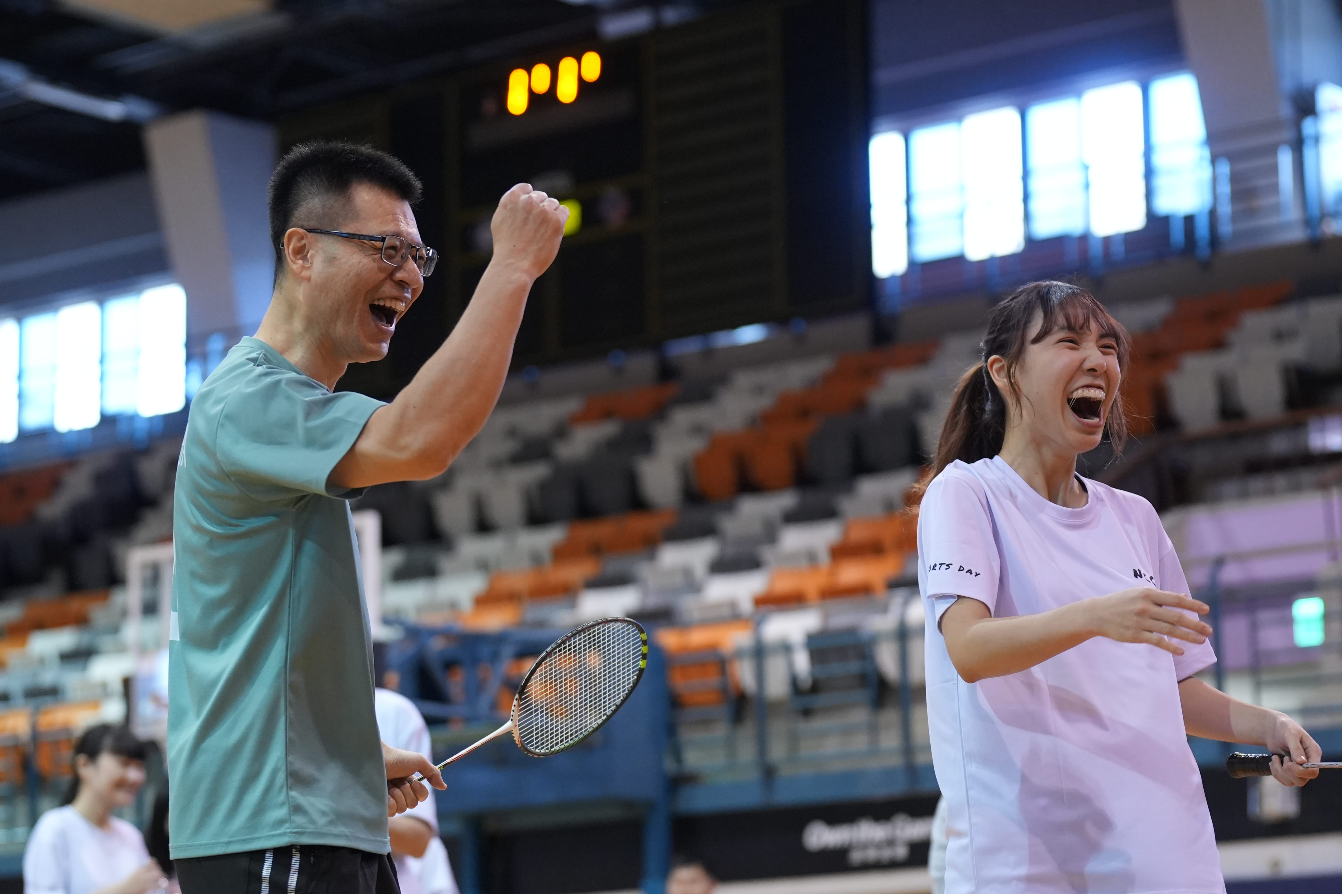 今年的羽球競賽也同樣是看點十足,除了同學們奮力拚搏之外,晉級賽中更上演了黃家齊教授與巫立宇教授精彩較勁的場面。而為了增加比賽樂趣,主辦單位也在決勝局開放選手使用創意道具替代球拍,於是便上演了使用雨傘、電蚊拍、檔案夾,甚至是汽水瓶等物品對戰的有趣畫面,為現場帶來不少歡笑聲。