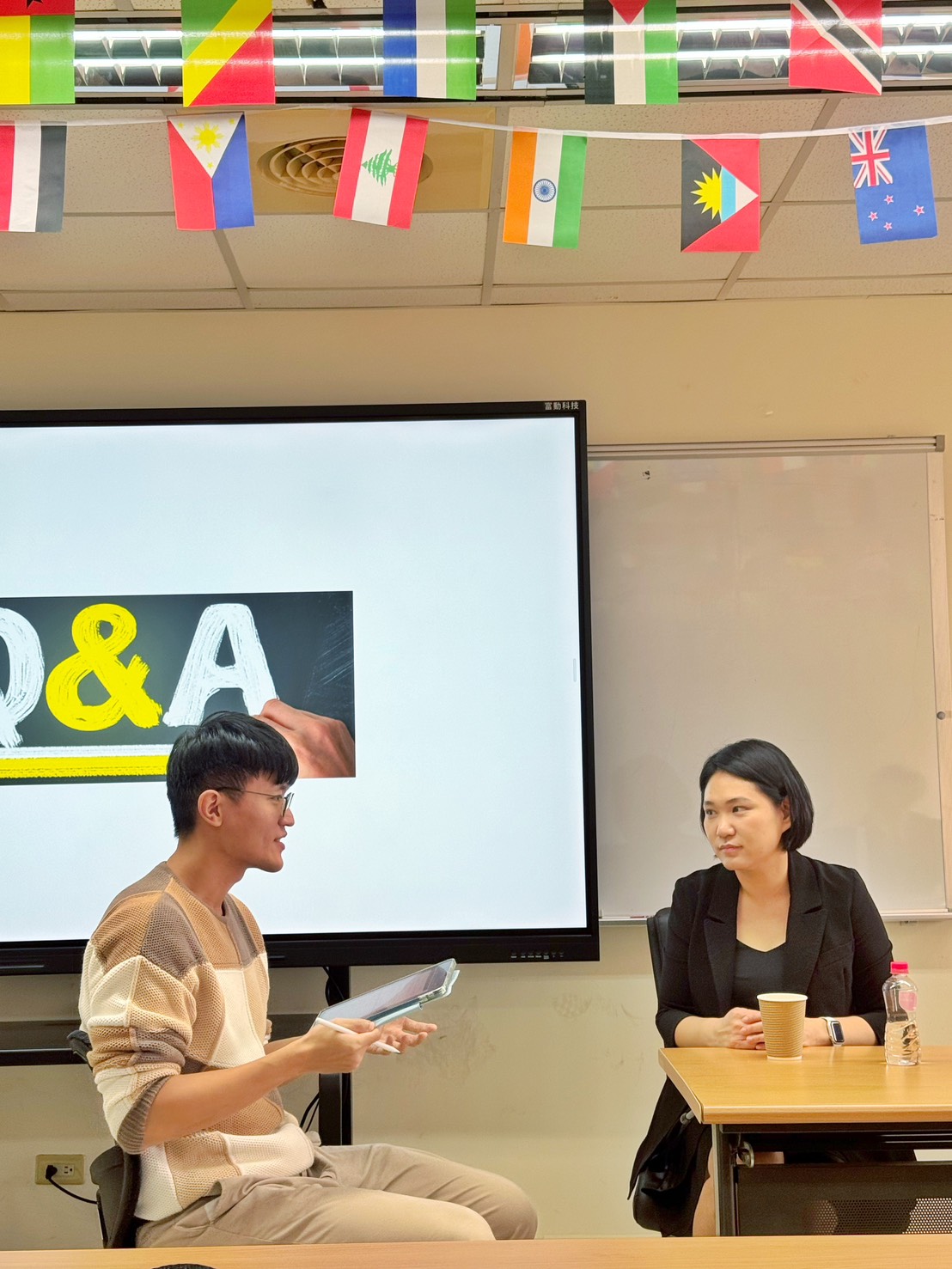 在問答環節中,有同學詢問貿協的實習與外派制度。汪經理表示,貿協確實提供實習機會,海外派任通常為期四年,中途返臺須自付旅費,外派者需具備高度自律及能與自己相處的能力,求取工作與生活的平衡。 談及臺商在東南亞市場的競爭情勢,他指出,中國企業在印尼約占90%,具備政府補助、速度快、資源多等優勢。反觀臺灣企業通常規模較小,但更重視在地化與品質。汪經理也呼籲,不要只用臺灣的經驗看世界,了解競爭對手與當地市場,才能找到臺灣真正的特色與優勢。